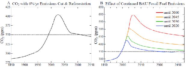 CO2 Emission Reduction Scenarios. A 6%/year decrease of fossil fuel emissions beginning in 2013, with 100 GtC reforestation, achieves a CO2 decline to 350 ppm near the end of this century (Fig. 4A). Cumulative fossil fuel emissions in this scenario are ~136 GtC from 2012 to 2050, with an additional 15 GtC by 2100. If our assumed land use changes occur a decade earlier, CO2 returns to 350 ppm several years earlier, however that has negligible effect on the global temperature maximum calculated below.