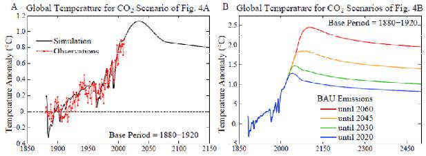 How fast atmospheric CO2 declines if fossil fuel emissions are instantly terminated (Fig. 3B) is instructive. Halting emissions in 2015 causes CO2 to decline to 350 ppm at the century's end (Fig. 3b). A 20 year delay in halting emissions has CO2 returning to 350 ppm at about 2300. With a 40 year delay, CO2 does not return to 350 ppm until after 3000. These results show how difficult it is to get back to 350 ppm if high emissions continue for even a few decades.