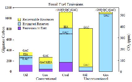 Fig. P1. CO2 emissions by fossil fuels (1 ppm CO2 ~ 2.12 GtC). Estimated reserves and potentially recoverable resources are from EIA (9) and GAC (10).