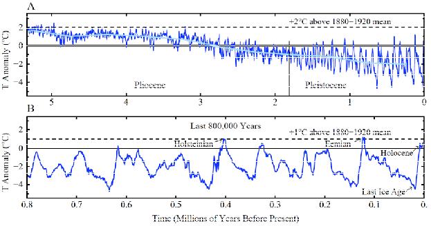 Paleoclimate data yield an estimate of eventual ice melt and sea level rise for a given global warming. The Eemian and Hosteinian interglacial periods (Fig. 2B), also known as marine isotope stages 5e and 11, respectively about 130,000 and 400,000 years ago, were about 1°C warmer than the