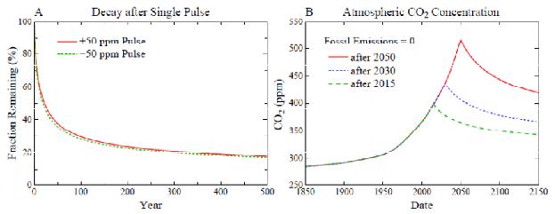 Fig. 3. (A) Decay of instantaneous injection or extraction of atmospheric CO2, (B) CO2 amount if fossil fuel emissions are terminated at the end of 2015, 2030, or 2050. Land use emissions terminate at the end of 2015 in all three cases.