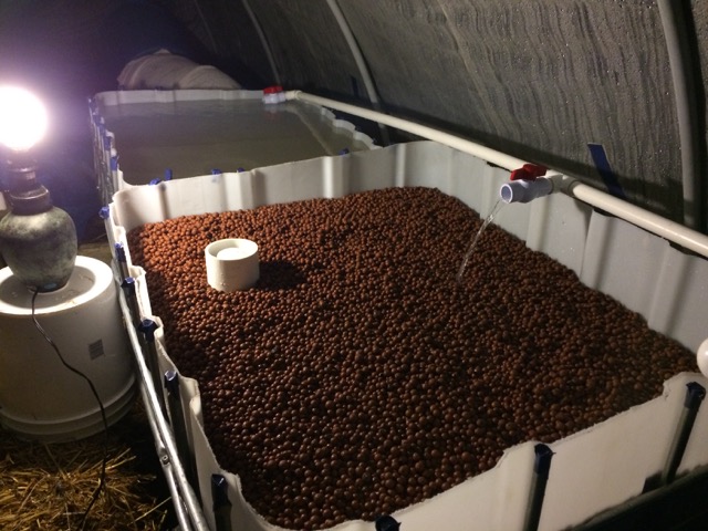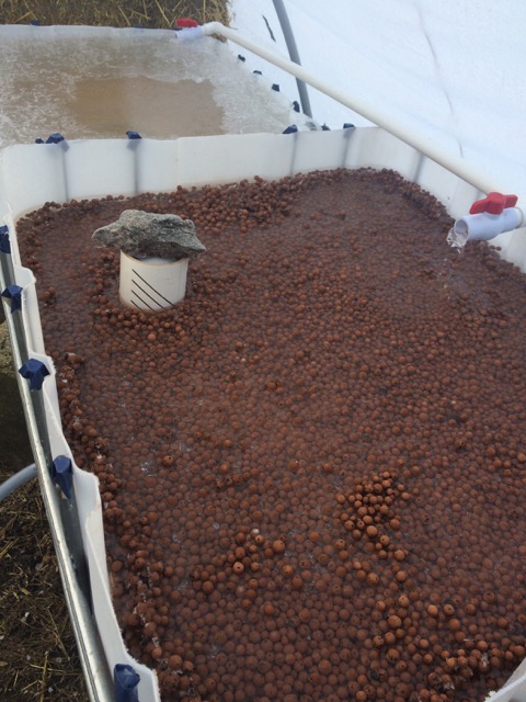 Arugala and Kale started in the grow bed. Note rock on bell siphon to keep it from floating up. Next is the floating raft grow bed with all the holes cut for 3" cups that hold a little hydrotin medium. After that is the compost pile designed to give off heat in the greenhouse to keep things from freezing overnight.