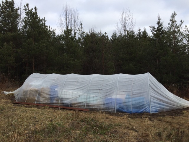 For the greenhouse we used the poly tunnel design with PVC pipes, 2 each for a 20 foot span and about 12 feet across on the ground. Put 3 foot rebar in the ground on each side to hold the PVC pipe and join them in the middle at the peak of the poly tunnel greenhouse. Order some poly designed for greenhouses, 20' x 50'.