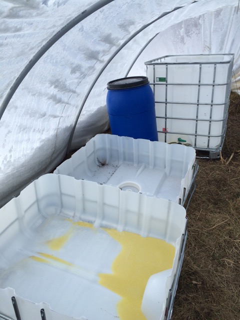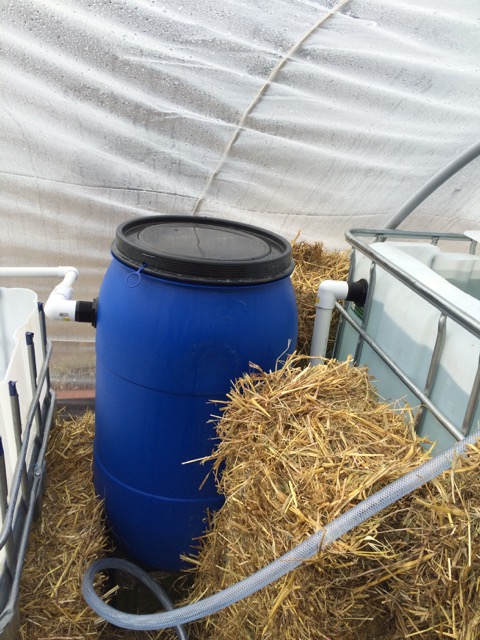 Greenhouse polytunnel with system showing through. From left to right we have the fish tank, then filter blue barrel, then hydrotin ebb-n-flow grow bed, and then last the floating raft grow bed. After that is a compost pile inside a hole and inside a stack of straw bales. This is designed to provide heat to the system. In the fish tank are also 2 x 300 watt water heaters.