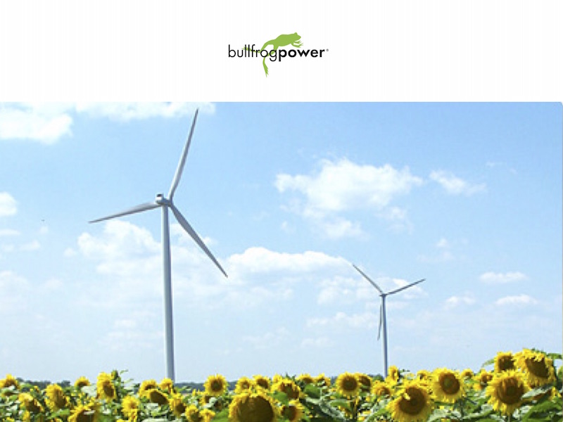 In 2005, along with five other people, we launched a company called Bullfrog Power. It offers home owners and business a choice that simply did not exist in this form before, an alternative carbon free source of electricity and natural gas. As a start, within about five minutes we can all reduce our carbon footprint by switching to 100% renewable energy for both the electricity and green natural gas that we use in our homes and business. Ultimately this simple act of signing up and switching to 100% renewable energy does much more than simply reducing your carbon footprint. It sends a message to your neighbours through the lawn sign or door sticker we send you and the discussions it will initiate...as it will for your business as you show your customers and competitors that you care about the future and are voluntarily reducing your carbon footprint. Of course we all know that by all common sense the switch to non-polluting energy sources, even if it costs a little more in the short term, creates a better future for us all and will save our children money...but we won't get into that by the convention we are irrationally asked to assume.