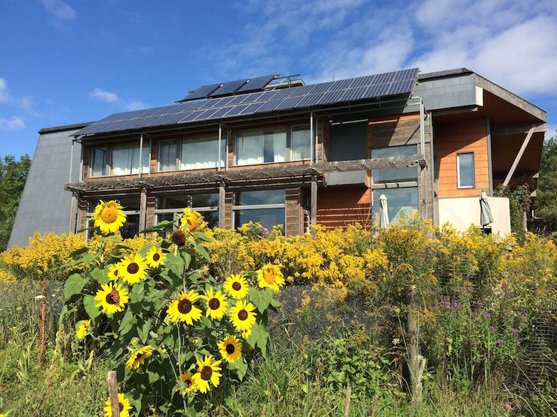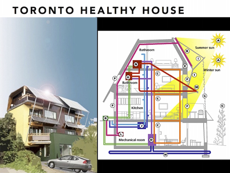 We were lucky, as we had the chance to tour the Toronto Healthy House in Riverdale, near the housing co-op, just after construction was completed. This award-winning sustainably designed house, architected by Martin Liefhebber, showed us how amazing incorporating solar, both thermal and photovoltaic, as an awning to enhance the passive solar design could be. My wife loved the tour and said, okay, now I get it, gorgeous, comfortable, love it, it works, let's do it.