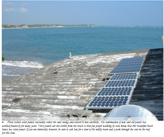Having spent our winter vacation there for the past ten years, I can personally testify to the benefit. When the power fails, and it always does several times during our stay, the beach house has lights for reading, fans to cool us, and even warm water for our showers. The system works in perfect silence while, unfortunately, the neighbors must power up noisy polluting diesel generators to keep their guests happy.