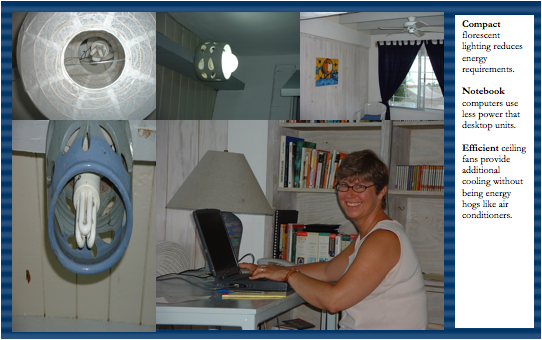 Inside the beach house all the lights are compact florescent to reduce power consumption. Of course the Wilsons are careful to make sure that lights are not left on especially when the electricity grid has failed and the house is operating on solar /battery power only.