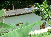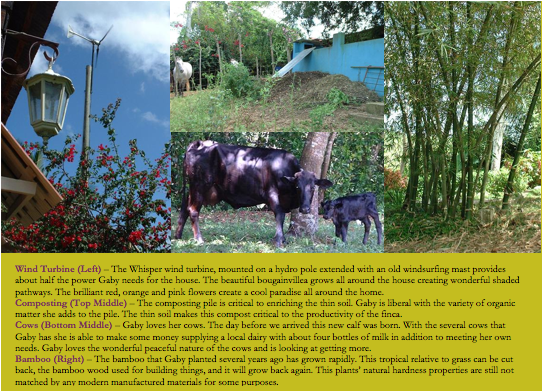 The finca has several other renewable energy systems. For the driveway lights a single small panel near the entrance gate (you can see it on the right post in the picture on the previous page) provides enough power for about four lights along her driveway at night. In order to do some small scale pumping and provide lighting in one of the farm's work sheds, another panel is used along with several batteries . Gaby says that she prefers a more distributed system since there is then less chance of all systems failing at once. This is a good analogy for the large scale centralized systems prevalent in North America. Witness the devastating Blackout we had in 2003, throughout eastern North America that cost the economies of Canada and the US millions, if not billions of dollars. By getting more distributed we can avoid such major disruptions.