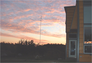 My parents' good friend, who looks after the beach house business, is also a solar pioneer. In fact, using the Solar House Book, Gaby was able to integrate a number of different second-hand panels and some new panels in order to provide power for water pumps on their farm. She also has enough power for home lights, TV, VCR, and stereo. Recently, she installed a wind turbine on top of an old windsurfing mast. Every time we visit the wind is blowing enough to keep the turbine going at a steady clip.