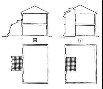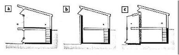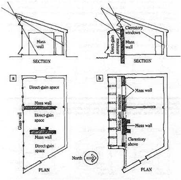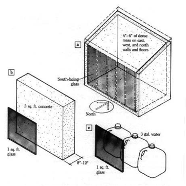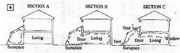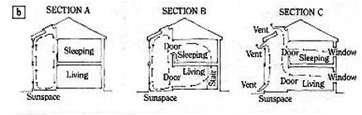 glass wall and high vents (a); A Trombe wall (b); A two-story sunspace (c).