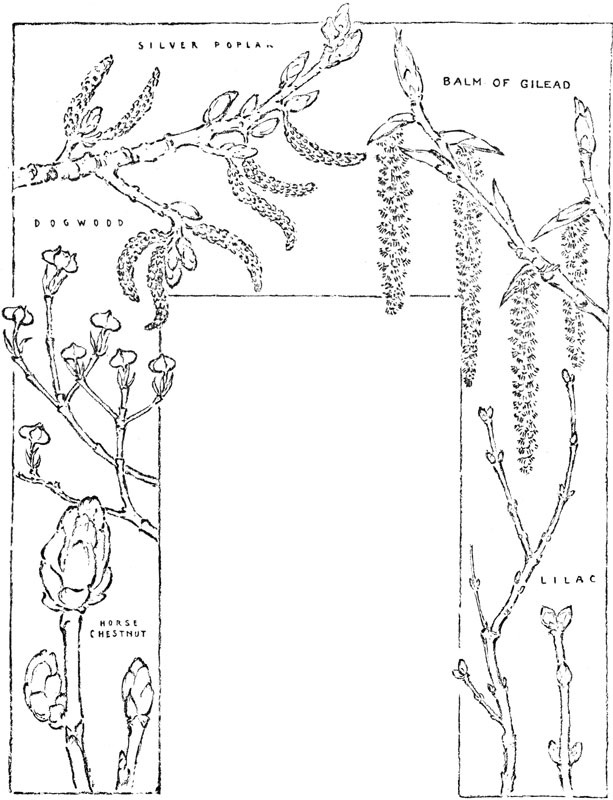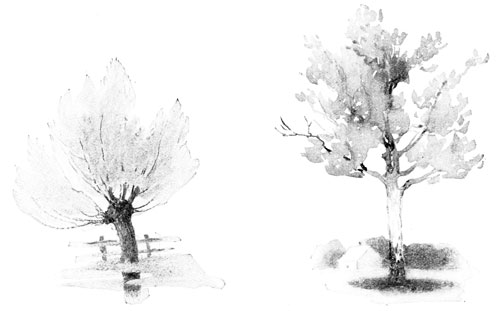 It is well to study a tree that is at some distance from you, so that its dark branches may be seen against the light sky. The willow and the sycamore are shown without their leaves on this page, and their shapes stand out clearly. You can see the strong trunk, and the branches that spring from it. The trunk of the sycamore becomes smaller as it throws off its boughs, and all the branches and twigs taper at the end.