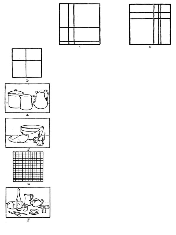 Sketches 1 and 2 show how vertical and horizontal lines may divide a square into a variety of spaces. Either arrangement is more beautiful than sketch 3, where the spaces are more nearly alike. Look at the still-life group in sketch 4, where the three objects are so nearly of the same size. Do you think this group as pleasing as the group shown in sketch 5? Our designs, as well as our pictures, must show variety and good arrangement of shapes and spaces, in order to be interesting.