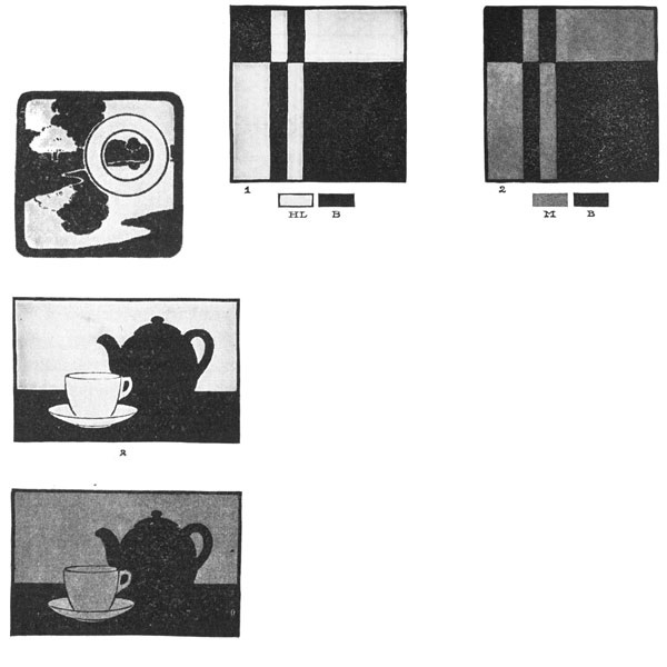One way of adding to the interest and beauty of large and small spaces is to show them in values. Compare Sketches 1 and 2 on this page with Sketches 1 and 2 on page 81. You will find the plaids which are shown in values more interesting than those which are made with lines only. The two values in each sketch on this page are chosen from the neutral value scale on page 80. In Sketch 1, High Light (HL) and Black (B) are used, and in Sketch 2, we find Middle (M) and Black (B). You see how different in effect the two plaids are. The same difference can be shown in landscape, flowers, or in any other picture or design, by changing the values. Sketches 3 and 4 show simple groups of still life, first drawn in outline from the objects, and then painted in values chosen from the value scale. Sketch 3 is painted in the same values as the plaid in Sketch 1, and Sketches 2 and 4 are alike in values.