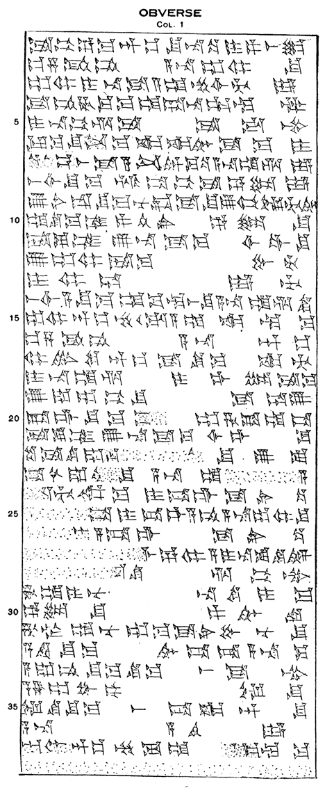 In the year 1914 the University Museum secured by purchase a large six column tablet nearly complete, carrying originally, according to the scribal note, 240 lines of text. The contents supply the South Babylonian version of the second book of the epic ša nagba imuru, “He who has seen all things,” commonly referred to as the Epic of Gilgamish. The tablet is said to have been found at Senkere, ancient Larsa near Warka, modern Arabic name for and vulgar descendant of the ancient name Uruk, the Biblical Erech mentioned in Genesis X. 10. This fact makes the new text the more interesting since the legend of Gilgamish is said to have originated at Erech and the hero in fact figures as one of the prehistoric Sumerian rulers of that ancient city. The dynastic list preserved on a Nippur tablet1 mentions him as the fifth king of a legendary line of rulers at Erech, who succeeded the dynasty of Kish, a city in North Babylonia near the more famous but more recent city Babylon. The list at Erech contains the names of two well known Sumerian deities, Lugalbanda2 and Tammuz. The reign of the former is given at 1,200 years and that of Tammuz at 100 years. Gilgamish ruled 126 years. We have to do here with a confusion of myth and history in which the real facts are disengaged only by conjecture.