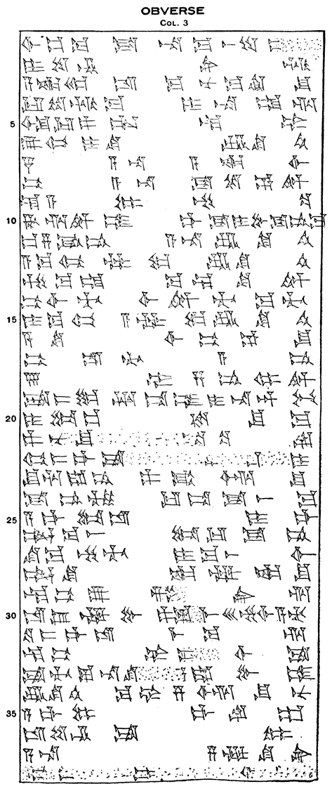 Dark brown unbaked tablet. Three columns. Lower edge slightly broken. Knobs at left upper and left lower corners to facilitate the holding of the tablet. H. 7 inches: W. 6½; T. 1½. Second tablet of the Epic of Gilgamish. [125]