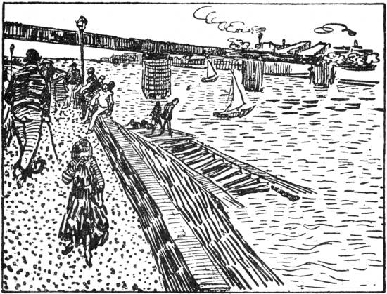 drawbridge, with a small yellow carriage upon it and a group of washerwomen. In this study the ground is a glaring orange, the grass is very green, and the sky and the water are blue. It must have a frame of royal blue and gold, the inside blue and outside a gilt moulding. The frame might be made of blue plush; but it would be better to paint the wood blue.... I cannot find time to write a quiet letter; my work absorbs me too much. But what I particularly wished to say to you is that I should like to paint a few studies for Holland, so as to have done with it. Quite recently, whilst thinking of Mauve, T., our mother and Will, I got more excited than was good for me, and I was comforted by the thought of painting a few pictures for home. After that I shall think no more about them, and think only of the petit boulevard.