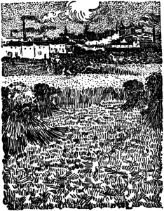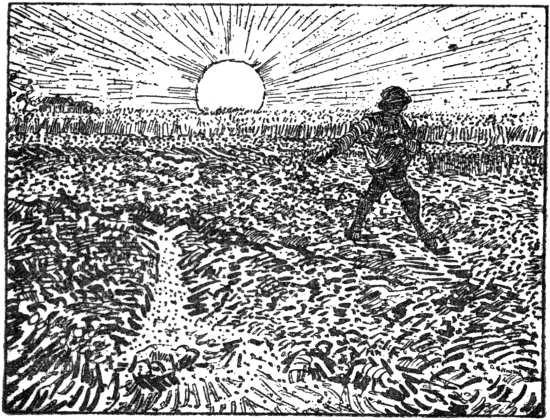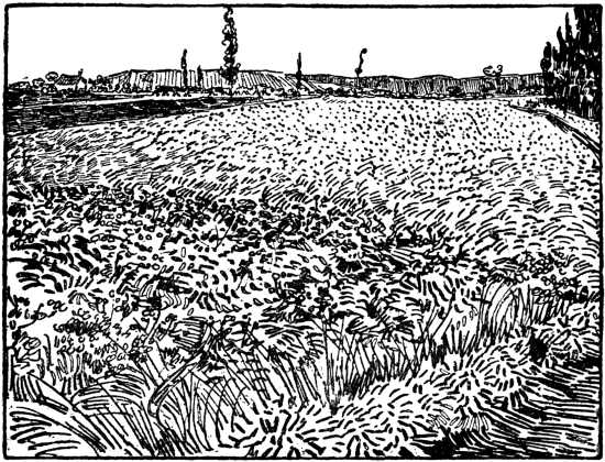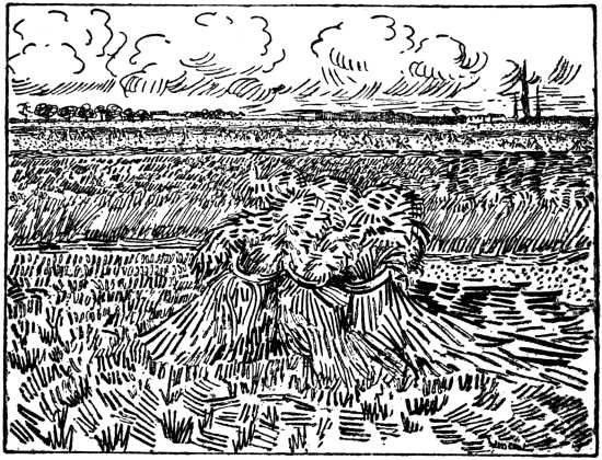 It is now, too, that he writes to his friend Bernard: “I have painted seven studies of corn; unfortunately quite against my will,[7] they are only landscapes” (page 75), and that he feels sympathy with a soldier who prefers a landscape to the sea, because the former is inhabited (page 85). This alone is already a sign that he is turning his back on the sentimental and negative love of landscape as landscape, peculiar to the modern English, French, and Germans, inspired by Rousseau and Schiller—that love of landscape in which man or the hand of man is entirely absent.