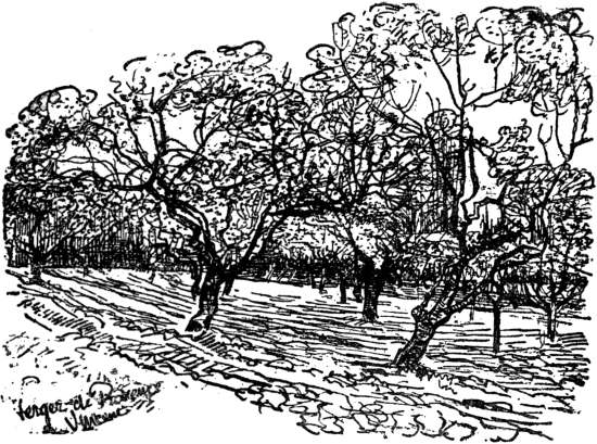 I have a new orchard which is just as good as the pink peach trees. It is an orchard of apricot trees, most delicately pink in colour. At present I am working at some plum-trees with yellow-white blossom and a maze of black branches.